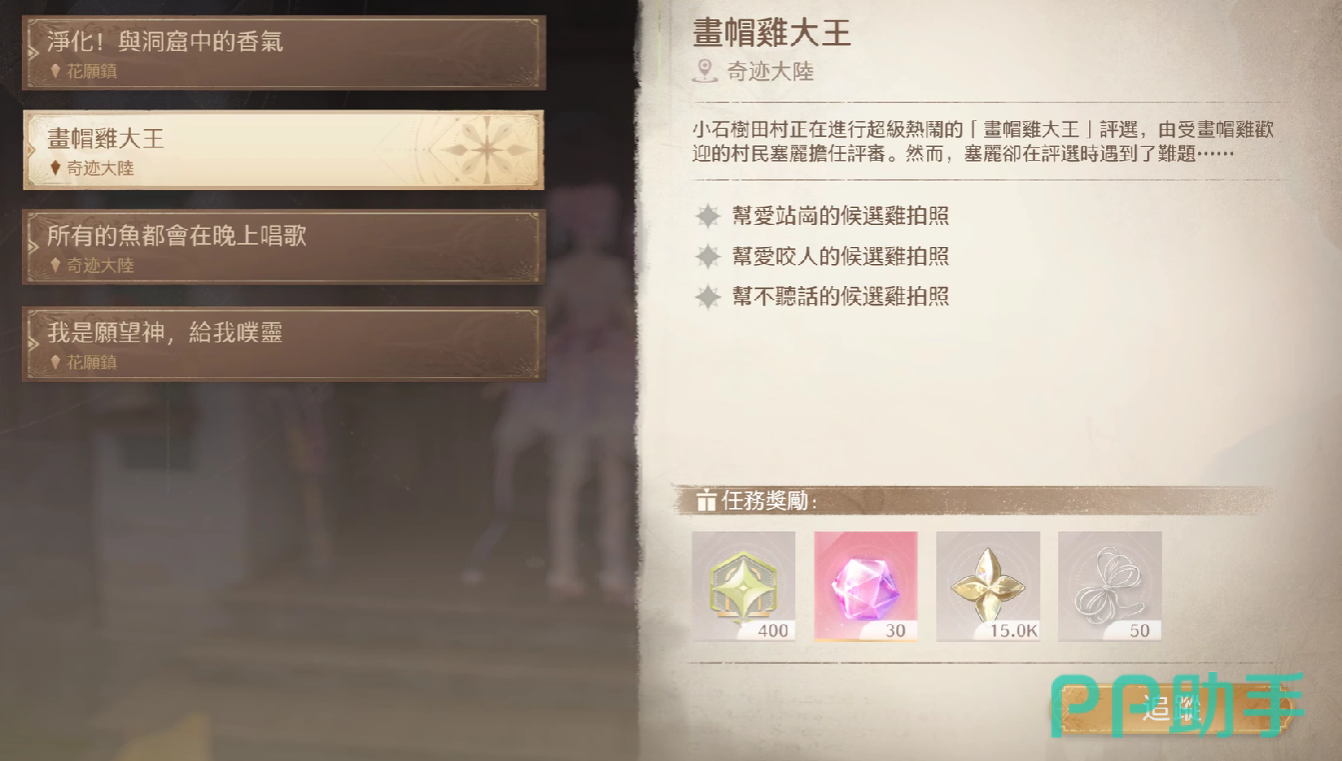 画帽鸡任务是游戏当中的一个支线任务,玩家在小石树田村进行探索时,行动到村居岔路的范围内,就可以从村民赛琳处得到一个支线提示,玩家主动接取之后,就能够获取任务引导了,完成这个任务之后,玩家不仅可以获得四百个噗灵,还能够获得三十个星光数值,这里的奖励在前期来说是非常丰厚的。
