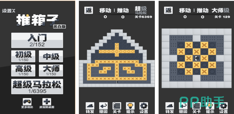 这款黑白画风经典版本的推箱子游戏玩起来别具特色,简单点触屏幕进行移动就可以将所有的箱子推回原位,游戏操作一如既往的简单且规则也十分有趣,甚至还给各位推箱子手游高手准备了多个游戏模式,如果你遇到了极难通过的推箱子关卡也可以试试提示功能,简单闯关的游戏机制让这款推箱子作品更具魅力。
