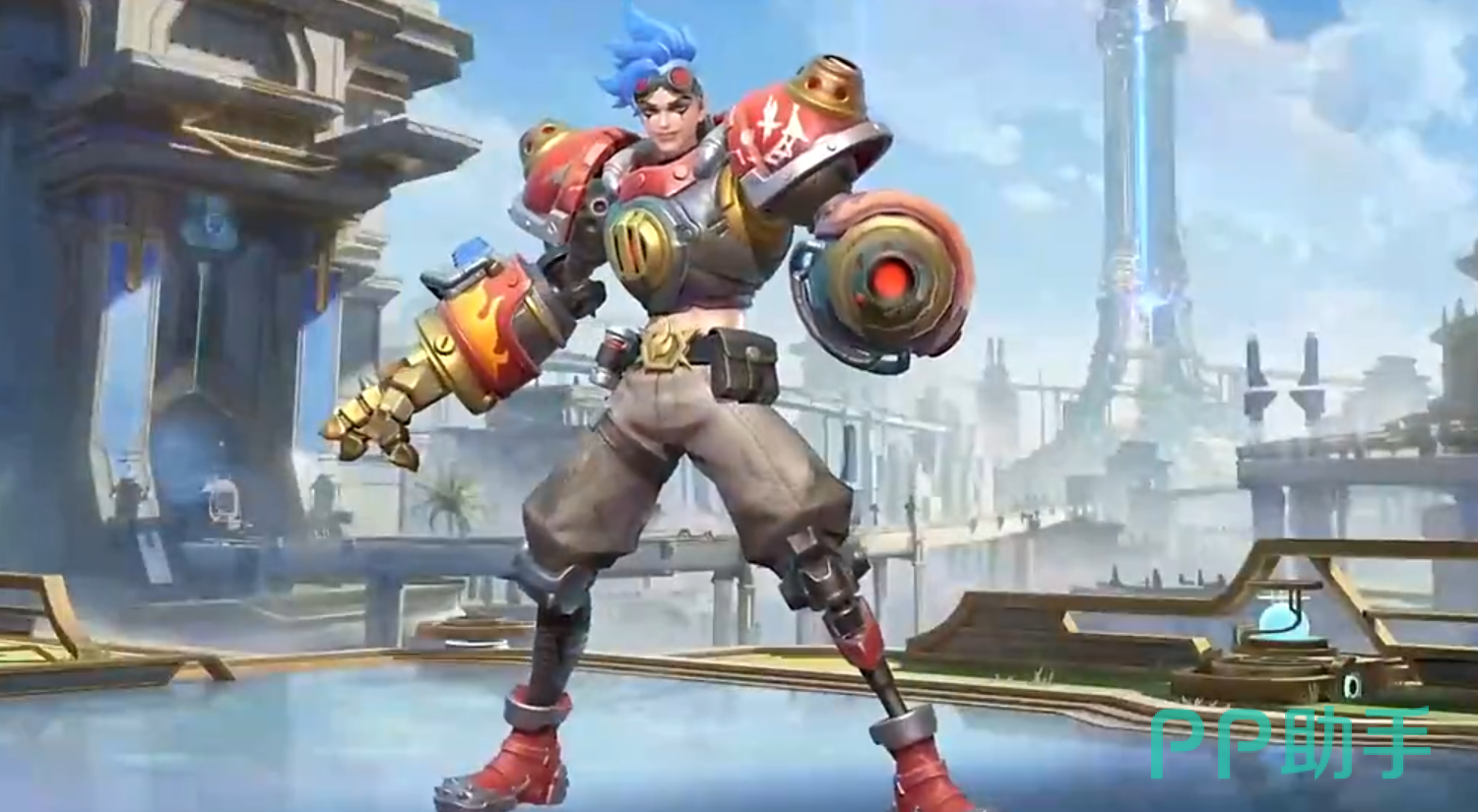 他的第二个技能是朝着前方发射一个可以拉回敌人或补给的火药桩,实战中可以使用其在安全的地方进行补给,他的大招会朝着前方位移并持续性的喷出火焰,一段时间后能破坏掉自己的装甲并对周围的全体敌方目标制造伤害。