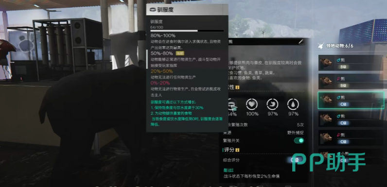动物被玩家捕捉回来以后,可以通过饲养来提升“驯服度”,驯服度达到80%以上的时候,动物在进食的时候有几率触发“求偶状态”,这时候如果家里恰好有一公一母,就能在幼崽小屋里产生幼崽。