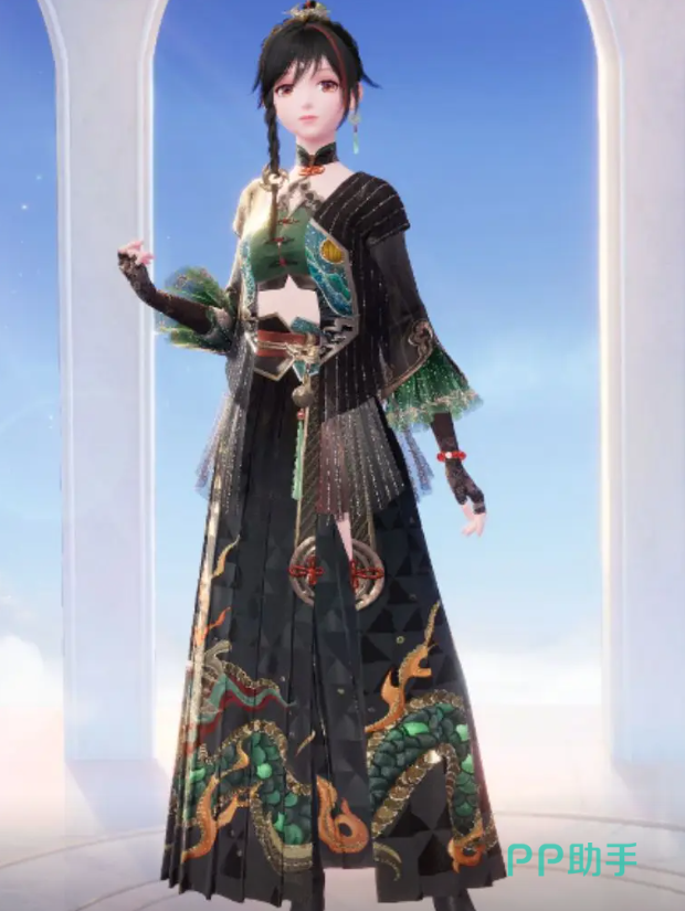 首先,这是一套主打帅气风格的中式风套装,整体的配色采用了黑绿色,不过却自带几分高贵感。一点都没有不协调的感觉,英姿飒爽的造型加上前胸的抹胸风格。更是增添了几分性感姿色,另外长裙上的龙纹造型,更是彰显了它的尊贵不凡之处。