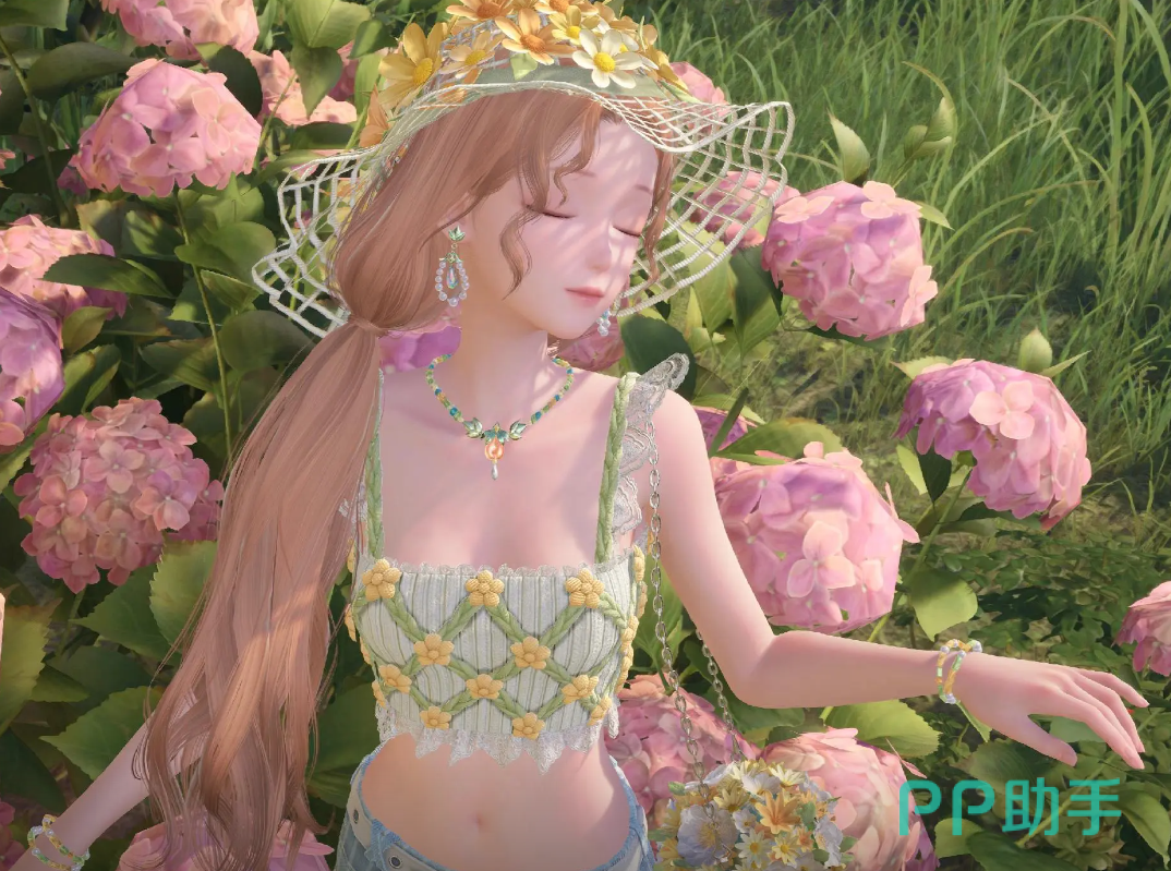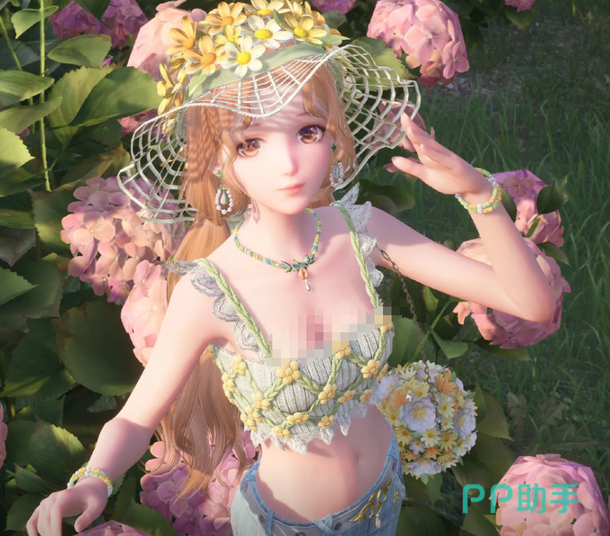 然后身上的衣服也采用了吊带背心的风格,一编织了一些花朵和藤蔓的元素。手上所携带的花朵时尚包包也别出心裁,然后还穿着牛仔裤。条纹样式以及花朵纹理点缀其中,更显得娇俏青春,富有活力。然后远观的手势,仿佛能让她看见远方的你。