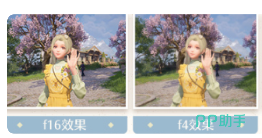 接着是光圈的调节,它直接影响到画面的景深效果,也就是照片中的前景和背景的清晰度。简单来说,光圈越大,景深越浅,背景会变得更加模糊,能够让观众的目光集中在主体上。光圈越小,景深越深,前后景物都能保持清晰。游戏的默认光圈为f16,适合拍摄需要全景清晰的场景。而光圈可调节的范围从f1.2 到f16,f1.2是最小光圈,能够制造出漂亮的背景虚化效果,非常适合拍摄人像或想要突出主体的照片。而f16则是大光圈,适合拍摄景物全景,能够让整个画面都保持清晰。如果你想拍摄暖暖穿着仙气十足的裙子,站在繁花丛中的场景,可以将光圈设置为f2.8或更小,背景的虚化能够让暖暖更为突出。而拍摄一些宏大场景时,选择f16全清晰效果,能够保留更多细节,呈现出更丰富的视觉效果。