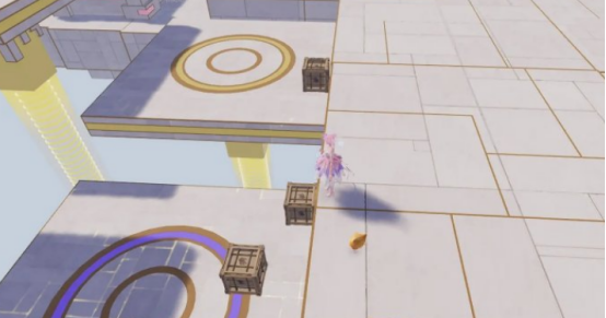 需要玩家跳到有两个控制台以及三个木箱子的平台上,先把两个箱子推到紫色的平台上,然后再将另一个推到黄色的平台上,通过这样做以后球在滚动的时候会更顺利一些,这个布局也是在推箱子时比较重要的一点,你需要了解。