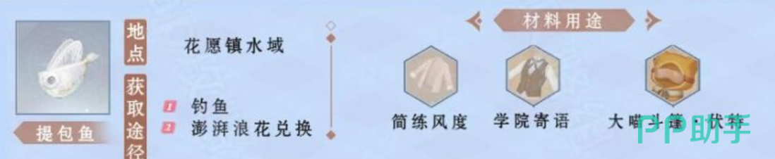 去花愿镇的水域当中,玩家可以钓提包鱼,提包鱼看上去相对独特,但是在尝试获得这种鱼的时候,除了钓鱼以外,玩家也可以尝试使用澎湃浪花来进行兑换。想要获得这种鱼类玩家不仅仅要简练的风度,学院的寄语,还需要大喵斗篷伏特。