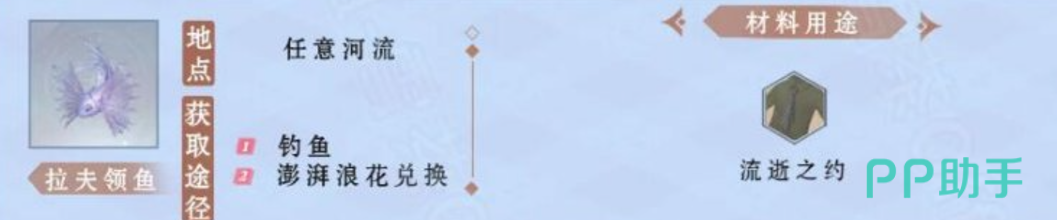 玩家可以去任意的河流当中去钓拉夫领鱼,这种鱼所需要的材料就是流逝之约,当然玩家想要获得这种鱼的时候,除了钓鱼这种方式以外,也可以尝试使用澎湃浪花来进行兑换。