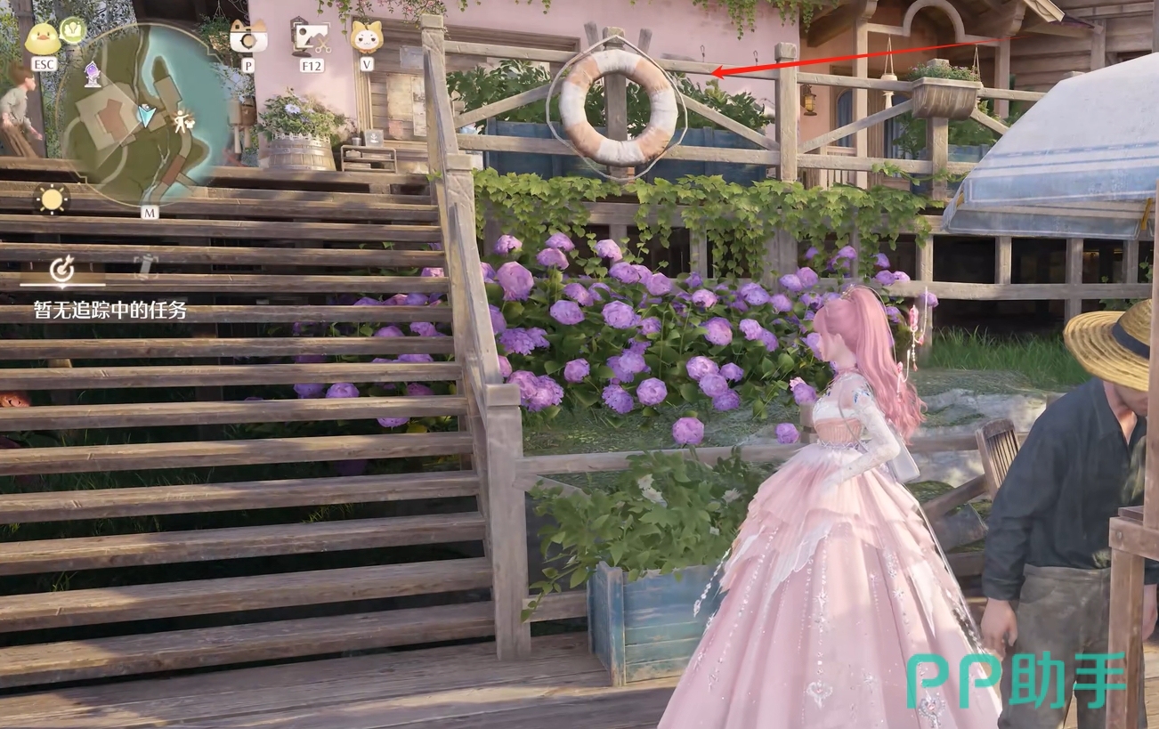 在任务点与琪亚拉交谈完后,人们可直接从她前方的楼梯下去,然后往回看就发现一个挂在栏杆上的救生圈,已经它背后被放在墙上的船桨。接下来的事就很好办了,只要开启相机,以救生圈为长耳兔的脑袋,并把船桨当作长耳兔的耳朵,调整好相机的拍摄角度,把这两样东西组合出长耳兔标签,就可按下快门完成拍照了。