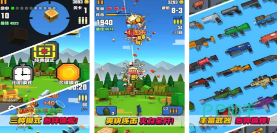 2d的像素画面,以及刺激的射击玩法结合在一起,在空中将会不断降落出各种物品,可通过连续射击的方式将所有物体彻底击毁,在连击之后也会进入狂暴的状态,在此状态之下,击败物体之后也能获得双倍的金币。操作方式特别简单,利用单只手就能顺利完成射击的任务,还有14把来自于世界各地著名的枪械,可通过收集以及使用的方式将物品彻底击碎。