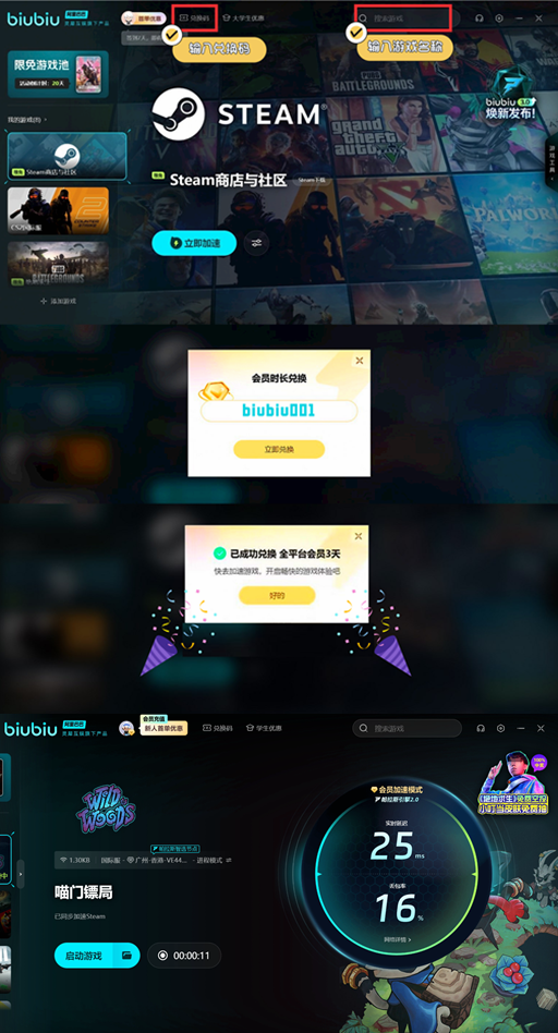 游戏的玩法机制是比较有创意性的,有押镖以及合作类的玩法,玩家也可以选择分工合作。但有时会受到网络卡顿的影响,要想解决问题,不如就用加速器来应对。之前没有注册过的用户在点击链接下载注册之后可以免费24小时。另外免费的福利可以长达96小时,新用户还可以在页面输入口令【biubiu001】得到72小时免费加速时长。