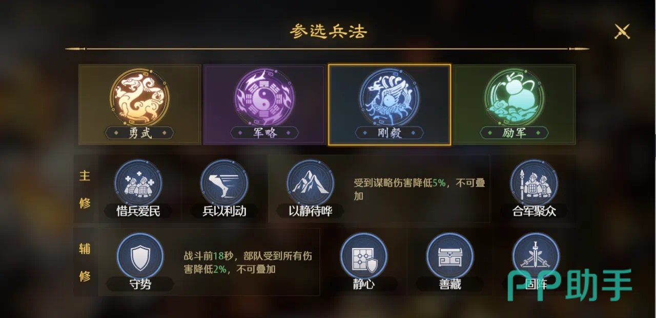 刚毅兵法主修的有惜兵爱民、兵以利动以及以静待哗,另外就是合军聚众能够使军队受到的谋略伤害降低,比较克制诸葛和司马这种武将;而辅修的有守势,战斗开局一段时间内部队受到的伤害会降低,还有静心,擅藏固阵等等,主要偏向于防守;最后励军相当于一个辅助兵法技能,用于提高阵容的各项属性,像士气值、谋略值等等。