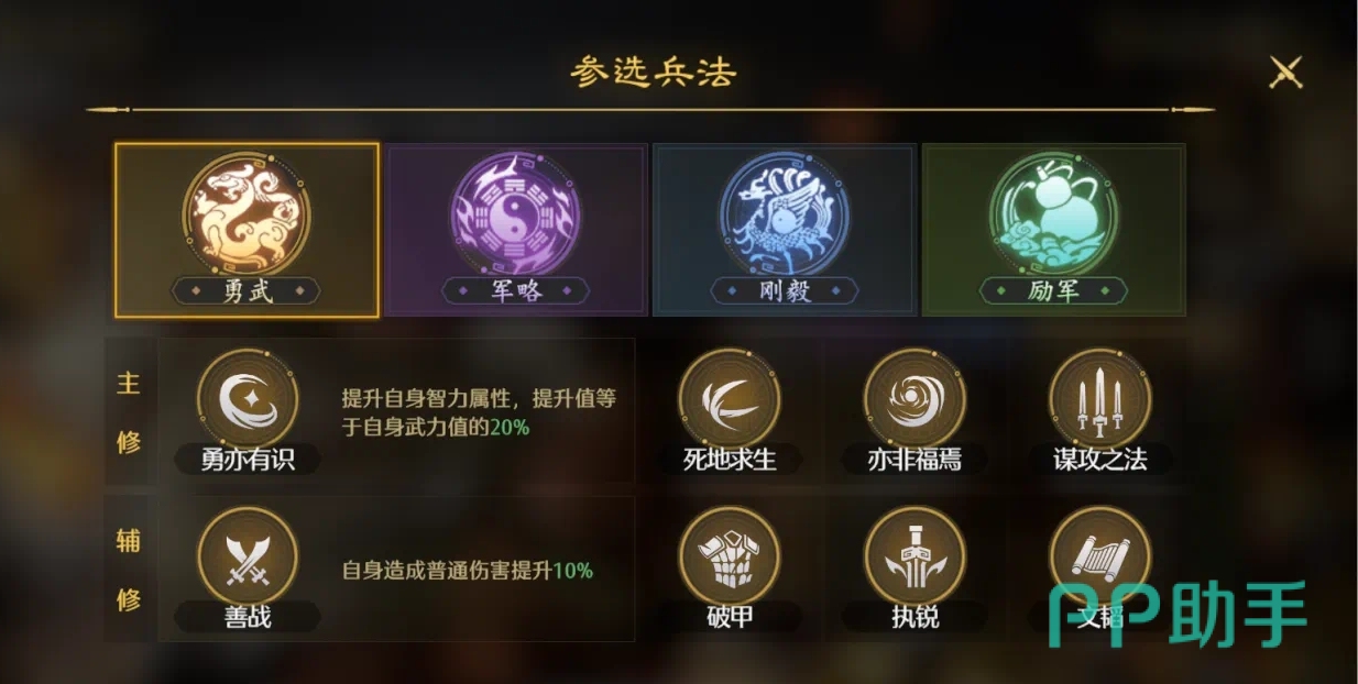勇武的兵法所对应的就是勇也有识、善战破甲等等,前者可以提升自身武力值百分比的智力属性,而后者则是普通伤害和暴击伤害分别会提高,除此之外还有执锐以及谋攻之法等等,偏向于进攻;军略则是可以将智力属性百分比转换为武力值,兵法介绍上基本都是会提升武将和队伍的技能攻击。