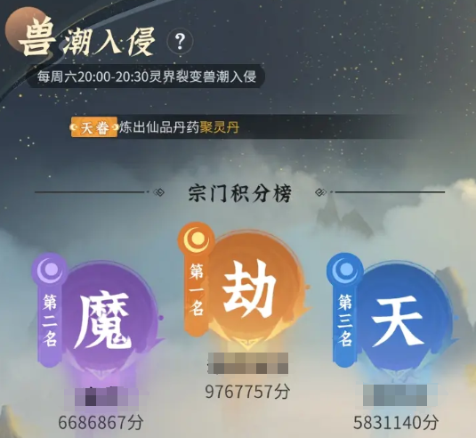 另外在宗门内每周六的固定时间段,灵界都会发生异变。这时就会涌现出大量的怪兽入侵,也就是所谓的兽潮。到时候我们就能点击加入参加战斗,当你在这次战斗中所获得的贡献越多,就能获得越多的奖励,并且还会按照你的贡献值进行排名。