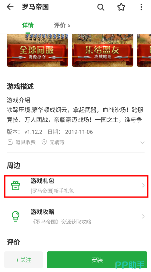 在豌豆荚内下载并安装完罗马帝国的玩家,点击进入游戏详情页,在游戏详情页内找到周边里面的游戏礼包。点开游戏礼包可以看见各个礼包的具体内容和领取的截止时间。