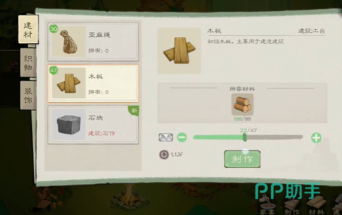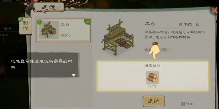 第二步制作木板。玩家打开建筑功能,选择工台页面。此时,工台的耐久度、繁荣、繁荣度都有显示。大家操作工台,选择木锤或者徒手,再设定好木头材料,进行木板合成。