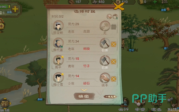 第二种途径是砍伐树木。大家在地图中寻找桃树、柳树的位置,点击树木,在弹出对话框中选择加号,挑中一位空闲的村民,进行砍树,就能获得木头材料。接下来,大家动手打造木板吧。