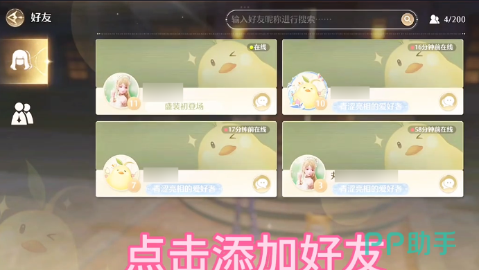 添加好友的操作超级的简单,玩家可以看到左上方会有一个鸭子图标,在点击之后马上就会有众多的功能选项。在这一些功能选项中,直接点击好友功能来马上进入到好友管理的页面,此时就可以看到有添加好友的操作。