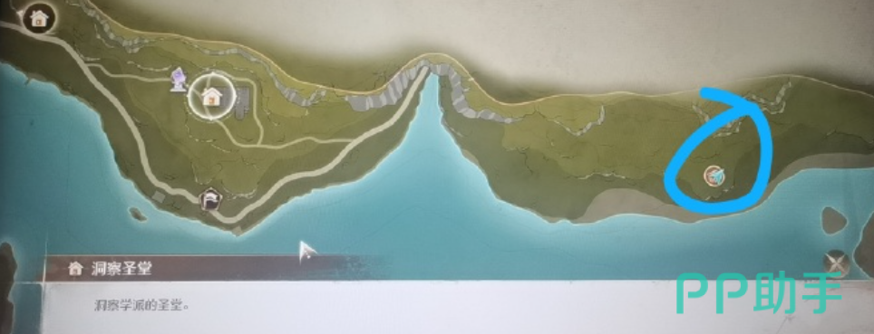 达到这里之后玩家还需要进行行走,顺着房子的方向一直往前走期间不要走小路也不要偏离方向。如上图随时,画圈的地方就是浮絮巨鸥位置,这个地方的名字叫做洞察圣堂。不过浮絮巨鸥位置并不是很精确,只是在画圈的范围里面寻找。