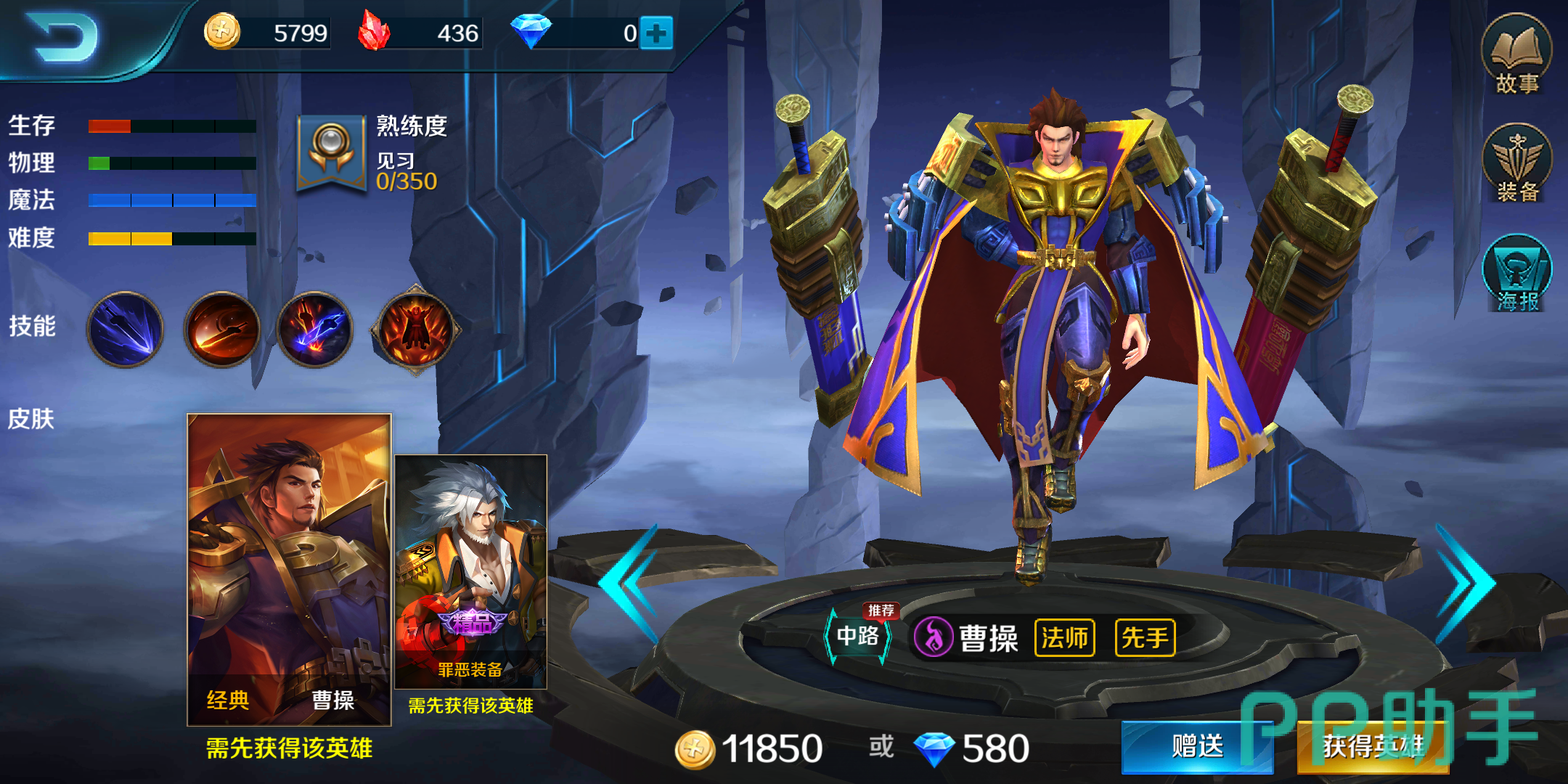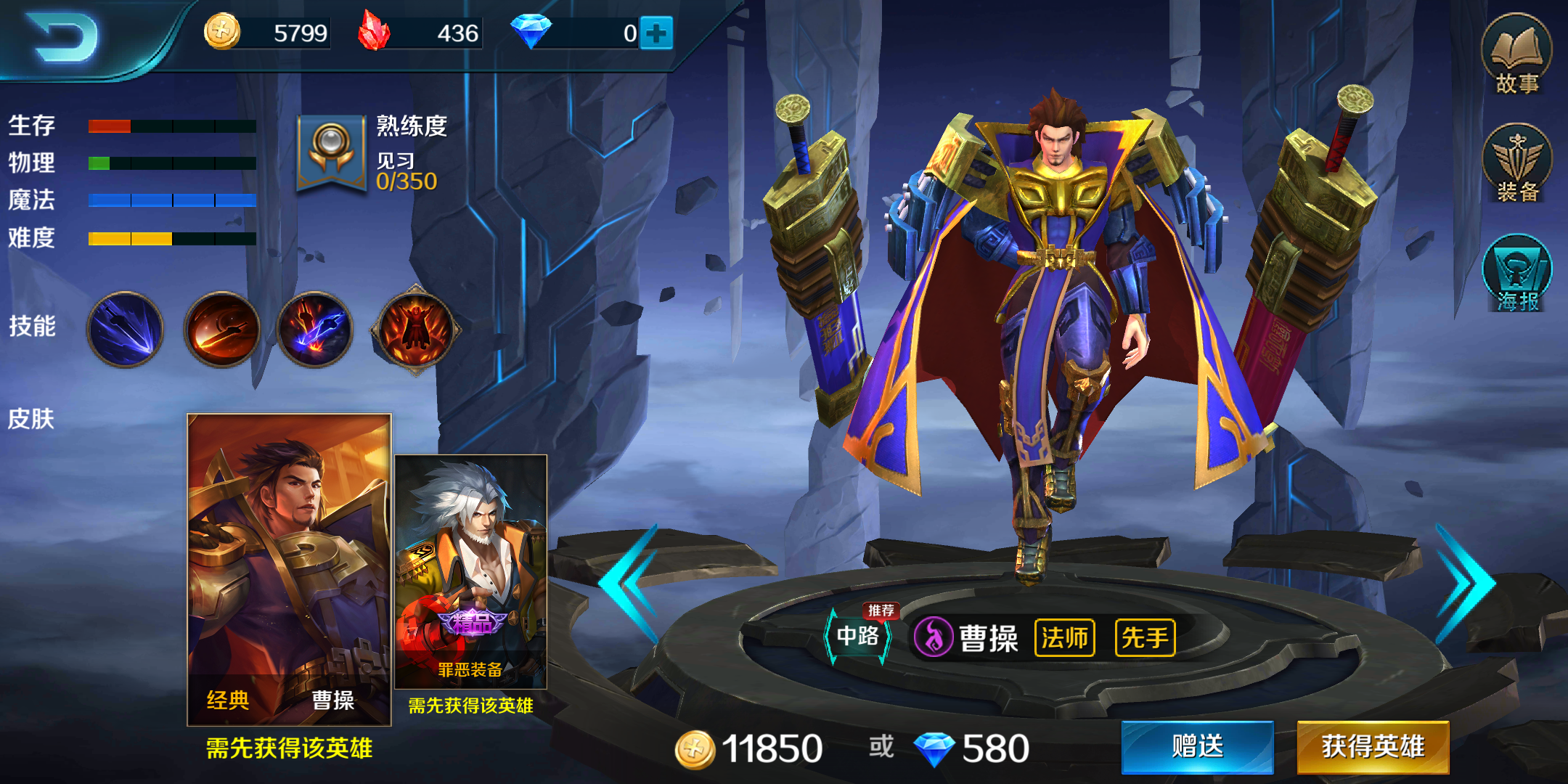 曹操的q技能可对指定目标造成单体伤害,如果击杀对方则可恢复50%魔法消耗。w技能和e技能都是小范围aoe伤害,记住,w技能可致盲敌方英雄一秒,另其普攻全部被闪避。大招r技能将对所有敌方英雄造成魔法伤害,同时获取地方视野两秒钟。