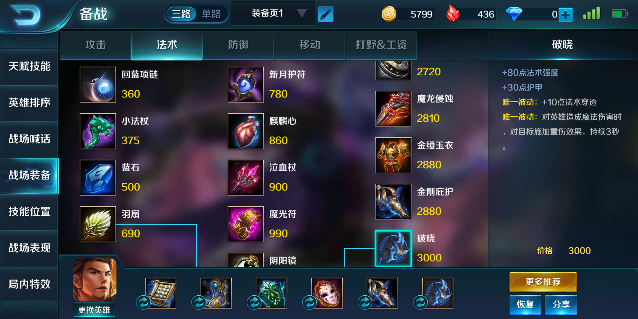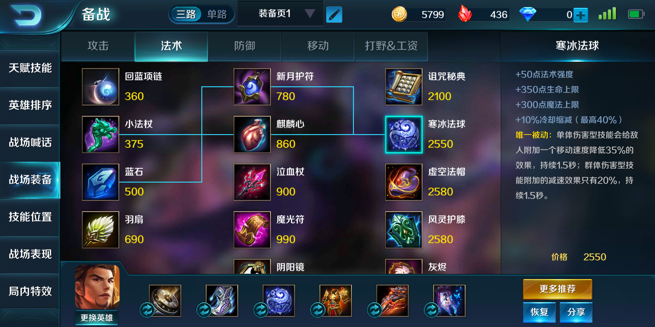 中期应尽快做出核心装备寒冰法球+金缕玉衣,可另曹操的技能对敌方造成减速效果,同时增加20%法术吸血能力。如果敌方阵容中有强力恢复型英雄,曹操可购买魔龙侵蚀进行针对。