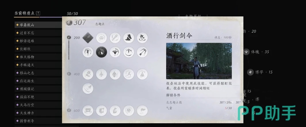特质选择时优先选择眼力与体魄结合。眼力属性解锁的技能范围很广,不只适用于投壶等有趣的游戏,也可以在收集、探索等方面给予更多的加成;体魄又是战斗与行动力的保证,非常适合热爱硬核战斗或者高效刷图。若喜好风雅、欲于丝竹雅韵中大放光彩,还可配以些高雅与心境之特点,考虑趣味性与个性化。