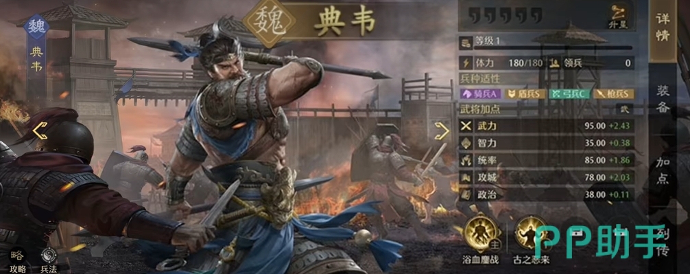其自带技能古之恶来可让他在被进行普攻时发动反击,而且能获得主将15%的武力,若主将是曹操则为30%,这一特性也令典韦更适合担任副将的位置。