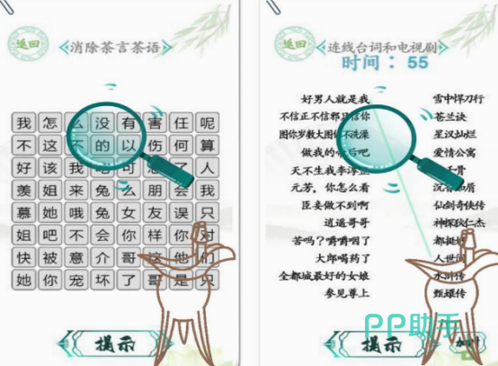 这是非常有创意的解谜小游戏,以大家熟悉的汉字找茬为玩法,每次闯关时有丰富的谜题。无论是将电视剧的名字和台词相连或者是其他的玩法,比如消除茶言茶语,都融入了现实生活中的一些元素,或者是比较有趣的梗。如果在玩的过程中并不知道真正的答案,没有思绪的情况下可点击提示,更能帮助大家顺利通关。