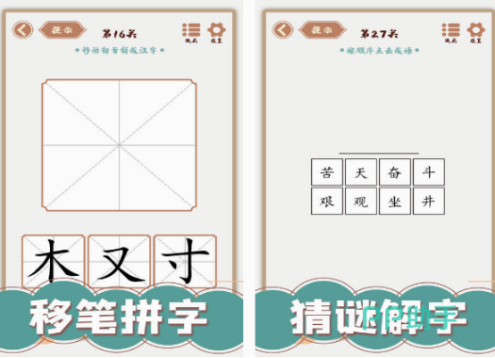 大家所熟悉的汉字都是由偏旁部首组成,如果书写不正确,或者写的时候多一笔少几画都是不可以的,这款具有丰富关卡的拆字游戏中,通过对简单文字移动的方式来拼成新的字。无论是移动偏旁或者是哪种方式,这都是支持拆文字的,只是关卡里会显示具体的内容,需要在每次闯关的时候根据相应的提示完成解答的任务,还收录了猜谜解字的玩法。