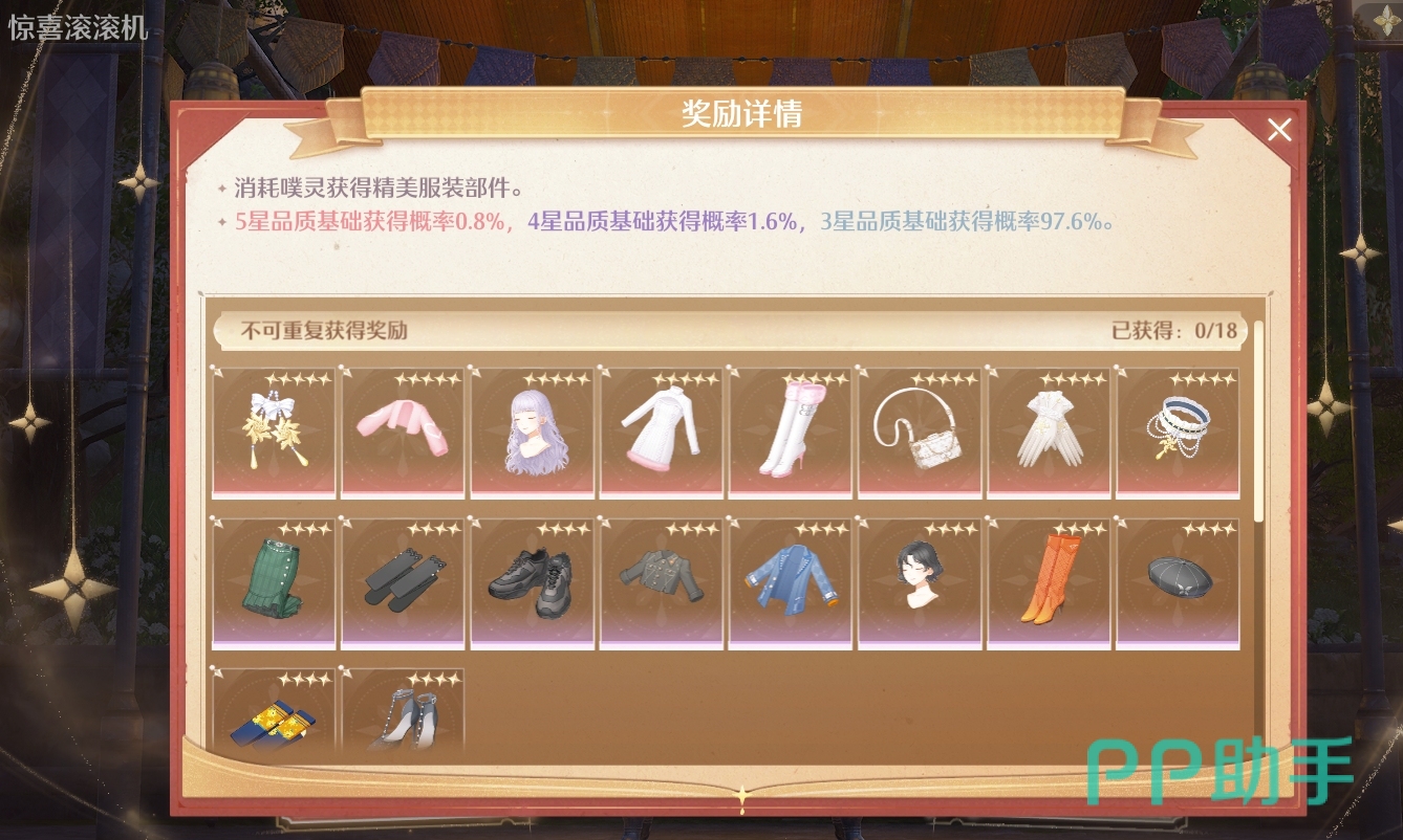 有一点好处是,小伙伴们获得的五星服饰是不会重复获取的,而且真抽到了五星,大家用于搭配也会有不少的提分,而且噗灵这种道具对于大家来说是免费的货币,只需要花时间去收集,也不需要充值,所以里面的衣服大家都可以免费获取,只是时间问题。
