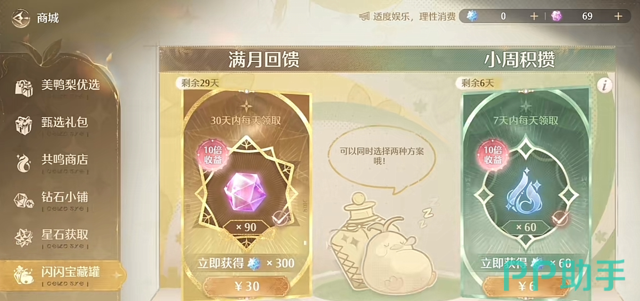 无论什么游戏都是这两个东西的性价比最高,无脑选择全部拉满是完全没有问题的。六个月卡和三十个周卡,总共计算下来的话能够获得三千六百个星石和一万六千二百个钻石。