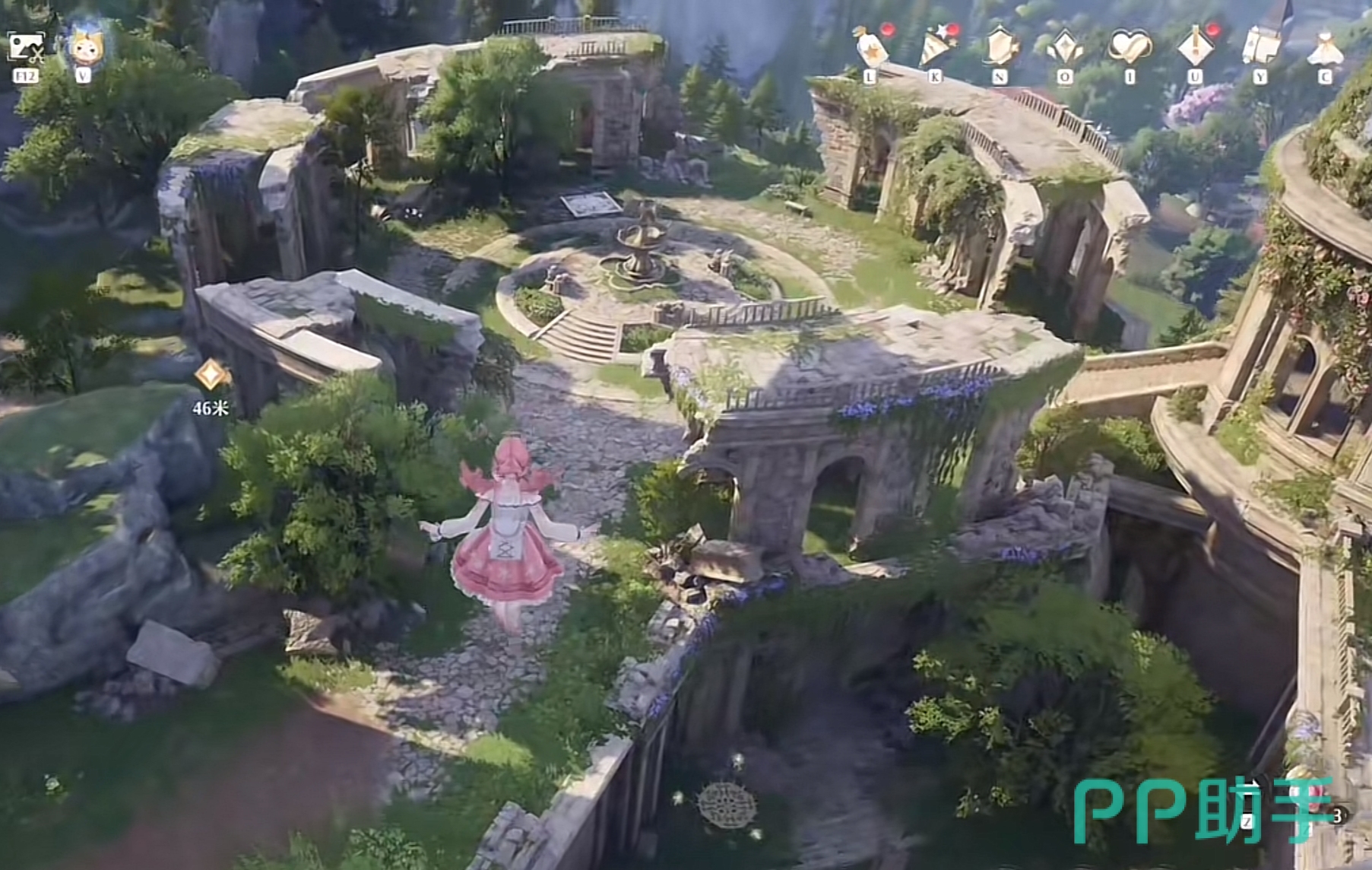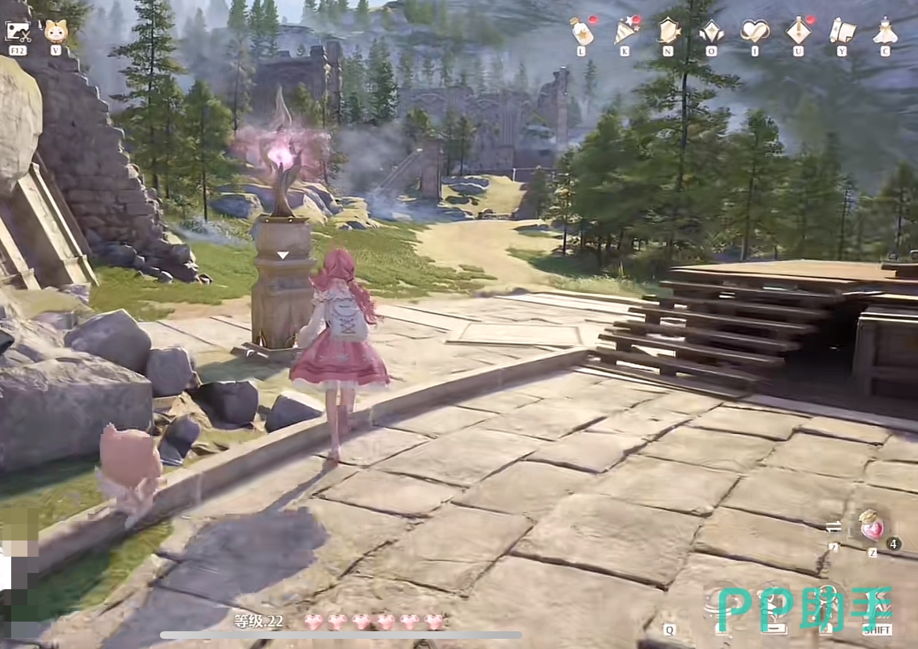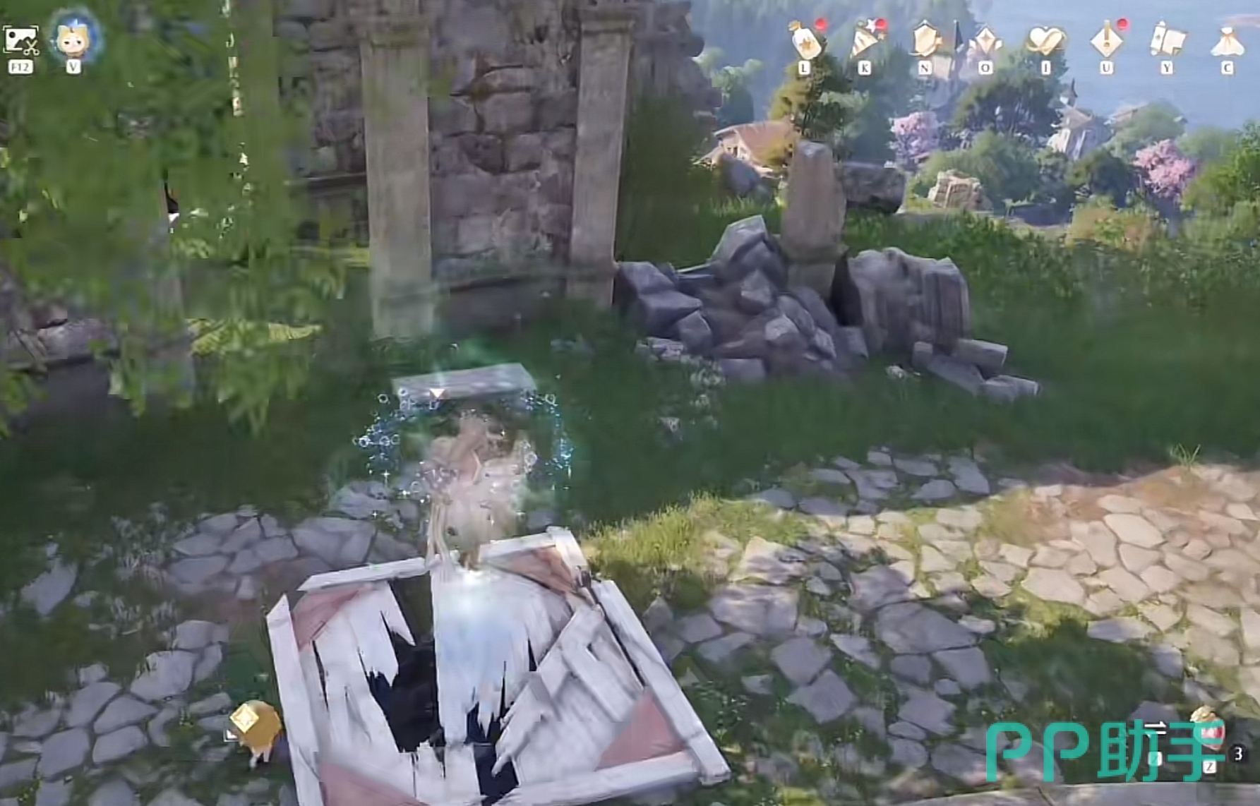 而在广场的上面其实也有一个,朝楼下跳的时候把视角拉向左边的草丛和石头,每个玩家在开这个走廊传送点的时候都是可以遇到的,跳上石头激活之后星之后,再从石堆跳上面前的遗迹废墟就可以完成一个收集碎片的小游戏,注意是有规定时间的,比较考研边缘跳跃手法,但这个相对来说也比较简单。