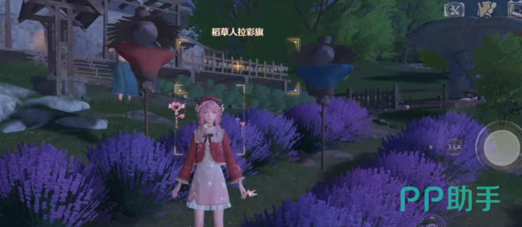 如图所示,可以看到花田里有两个稻草人,一红一蓝,没有看到彩旗在哪。其实彩旗就是在后面小屋那里,是在屋子前面的栅栏上,一连串的五颜六色的小板子,那就是彩旗。