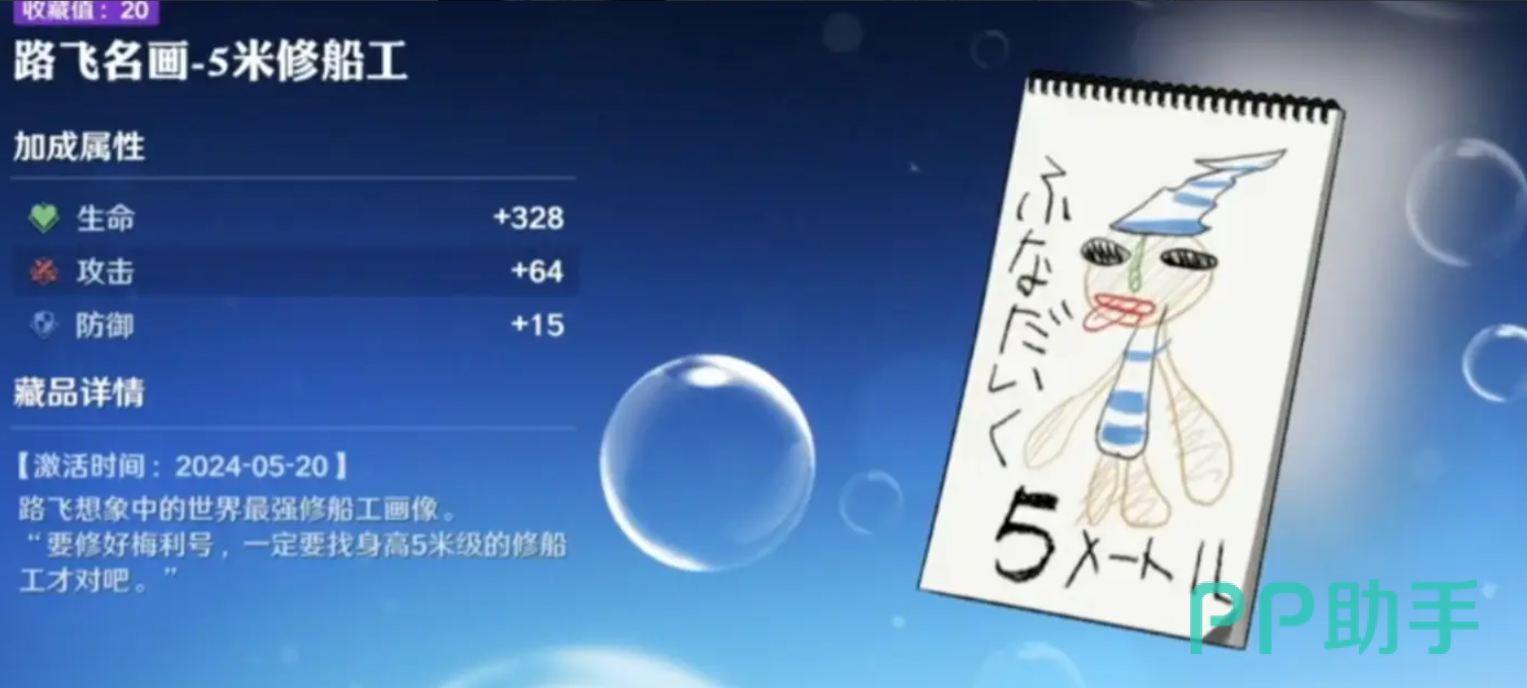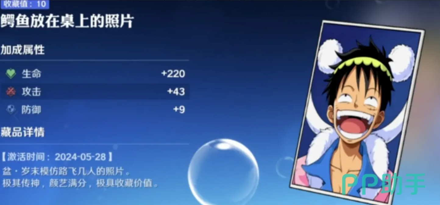 这件餐品记录了一张路飞模仿同伴的可爱照片,能加10的收藏值,220的生命、43的攻击和9点的防御,然后第二件的话叫做路飞名画,想要获取首先我们要进入海域探险的第二章的1区。