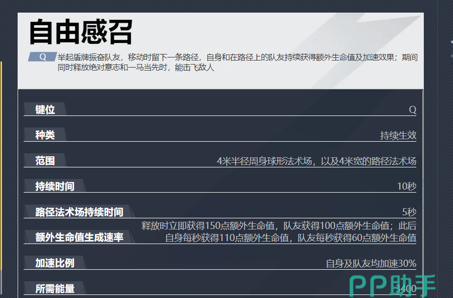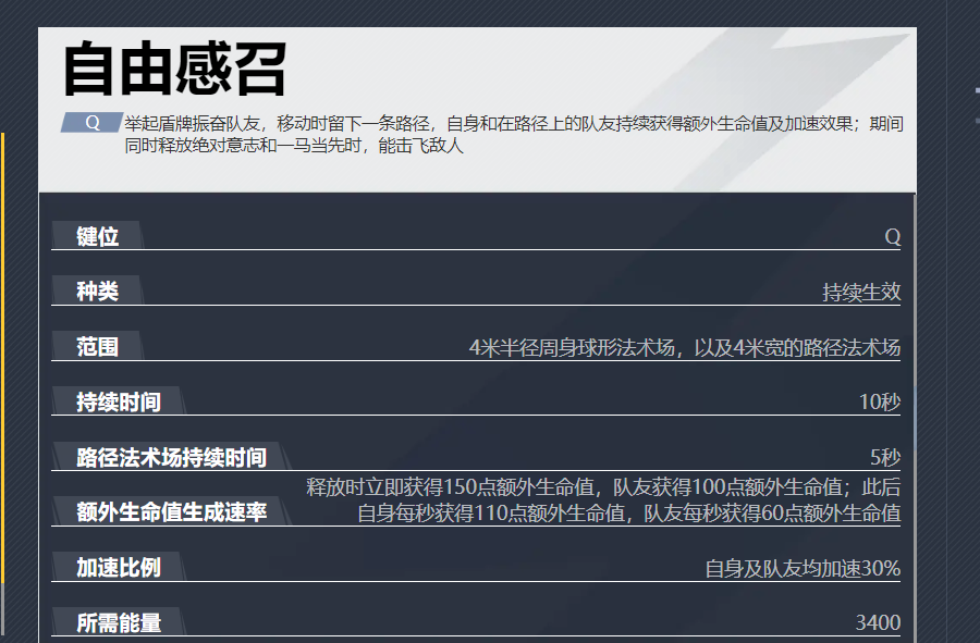 q技能是可以举起盾牌振奋队友的,并且移动之后还会在路面上留下一条路径,在此路径上的队友以及自身都可以得到额外的生命值加成以及移速加成,这个期间释放一马当先或者绝对意志还可以击飞敌人哦。