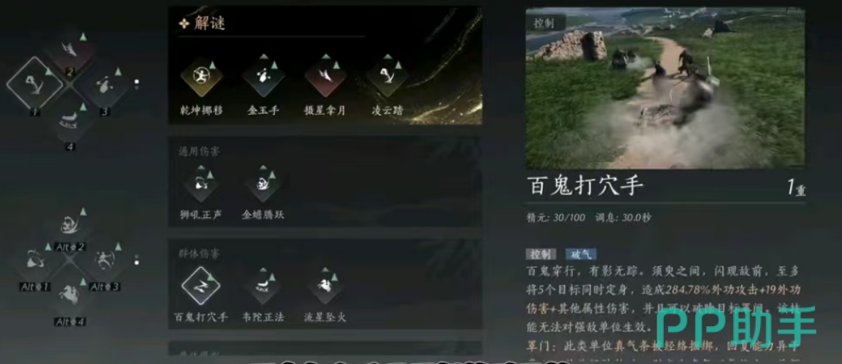 第一个奇术长风破浪,乘风破浪是随着角色成长的攻击型技能,释放时可以穿透敌人的防御机制并造成198%的外功伤害。第二奇术为百鬼打穴手。百鬼打血守为群攻技能,一次性可伤害5个目标,适合打小怪时使用。第三个奇术为百鸟竞逐,使用时可以召唤飞鸟,操纵飞鸟进行攻击,算是一个让人防不胜防的技能。