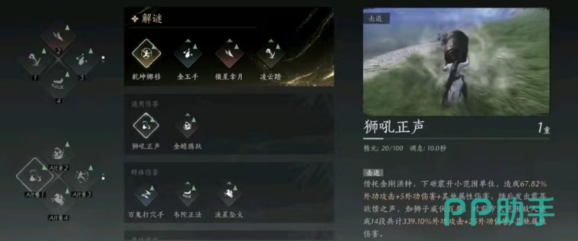 第四个奇术是神龙吐火,同样是一个攻击技能,释放技能时可以喷出火焰将前方的道路烧尽。第五个为太白醉月,释放技能后会得到一个假醉的状态,从而提升对敌人的伤害。第6个奇数为狮吼正声,也就是传说中的狮吼功,释放时可以发出巨大的吼叫,造成声波攻击,也是一个群攻技能。