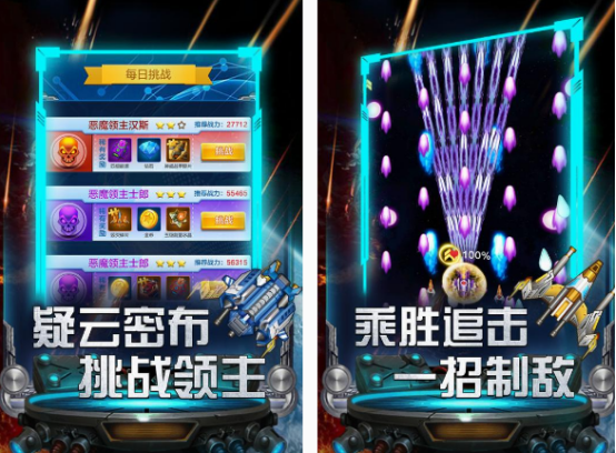 这款就是非常经典的以飞机大战为主的,操控战机开足火力就能帮助你完成更高的分数,除了在玩法特别的简单,给大家带来的超炫视觉效果也是很完美的。虽然与同种游戏的操作方式都一样,却能有不同感受。面对诸多敌机的过程中,你需要利用快速射击的方式接受挑战,面对超强boss级的敌机时,你更要发挥超强威力。