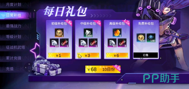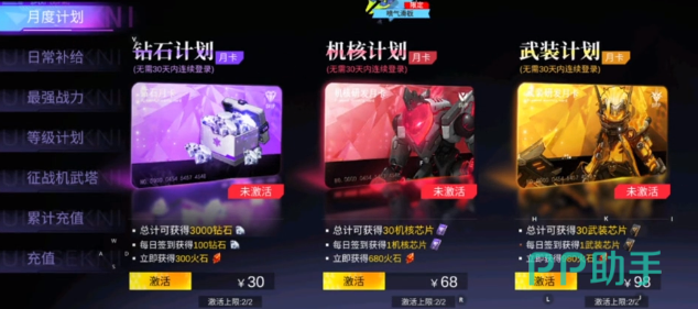 有条件的玩家建议直接把三张月卡全部拿下来,例如98元的武装计划,30元的钻石计划、68元的机核计划。如果激活月卡之后,玩家就可以获得3000个钻石,30个机核芯片,还有30个武装芯片。