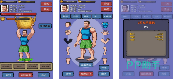 这款游戏通过一个简单的动作,不停地重复,从而让游戏里的角色达到使自己自身细胞不断进化的结果,并且从身体的每个细节上就能看得出来。该游戏操作简单,玩家通过扛鼎的过程中,可获得一些气势,这些气势积累多了起来,就可以升级自己的肌肉,让细胞进化,如增强手臂的爆发力等等,比较简单而粗暴。