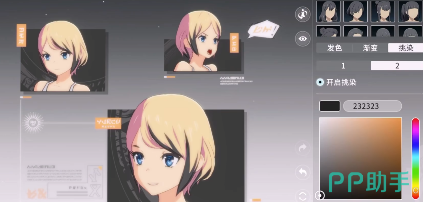 首先是发型页面,在这我们可以自定义发型。里面提供了多达数百种发型,我们可根据自己的喜好挑一种。自定义发型的话可以随心选择发色以及挑染程度,接着还能选择渐变发色。当然也可以自选发型,让你坐享其成。