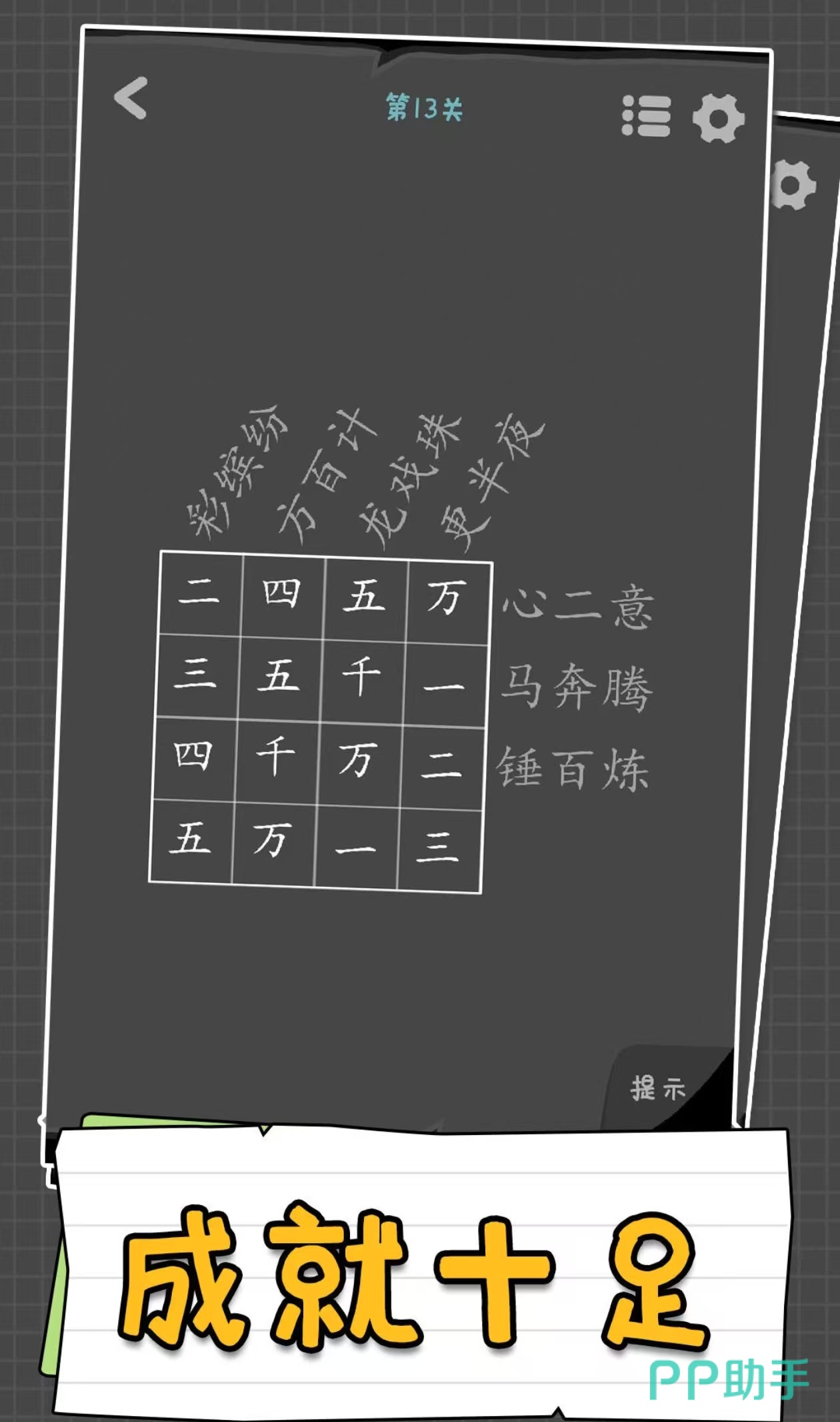 游戏围绕成语构建起丰富的关卡体系。画面细腻,用直观的图像呈现与成语相关的情境、角色等元素,玩家据此在知识储备里寻觅正确的成语。巧妙的画面构思与贴心的提示功能,使玩家尽情领略成语世界的奇妙,在游玩中锻炼思考力、丰富成语积累,于轻松氛围中体会中华传统文化的深邃内涵,各个年龄层的玩家皆可投身其中,畅享知识探索与趣味游戏的完美融合。