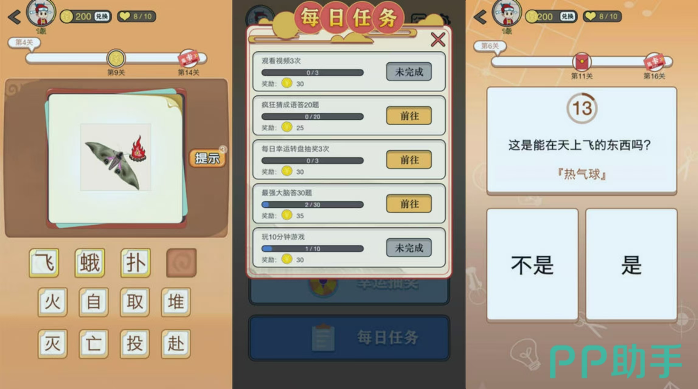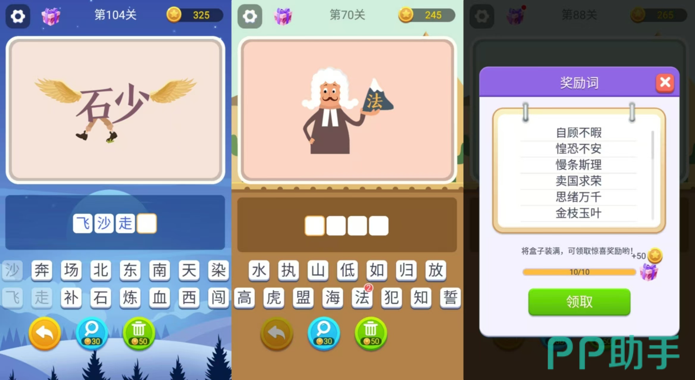 《猜词大师》可以把这款戏理解为文字拼图,通过这些题目可以有效的锻炼大脑,游戏里面设计的也非常善解人意,会从最简单的题目开始,逐渐的向困难题目靠拢,玩家需要根据每一个题目上面给出的图片提示,从给出的汉字里面进行选择,找出游戏里面隐藏的词语。答对题目之后可以解锁成就,获得的线索可以提示谜题,是单机游戏,在网络的情况下也可以畅快的玩。