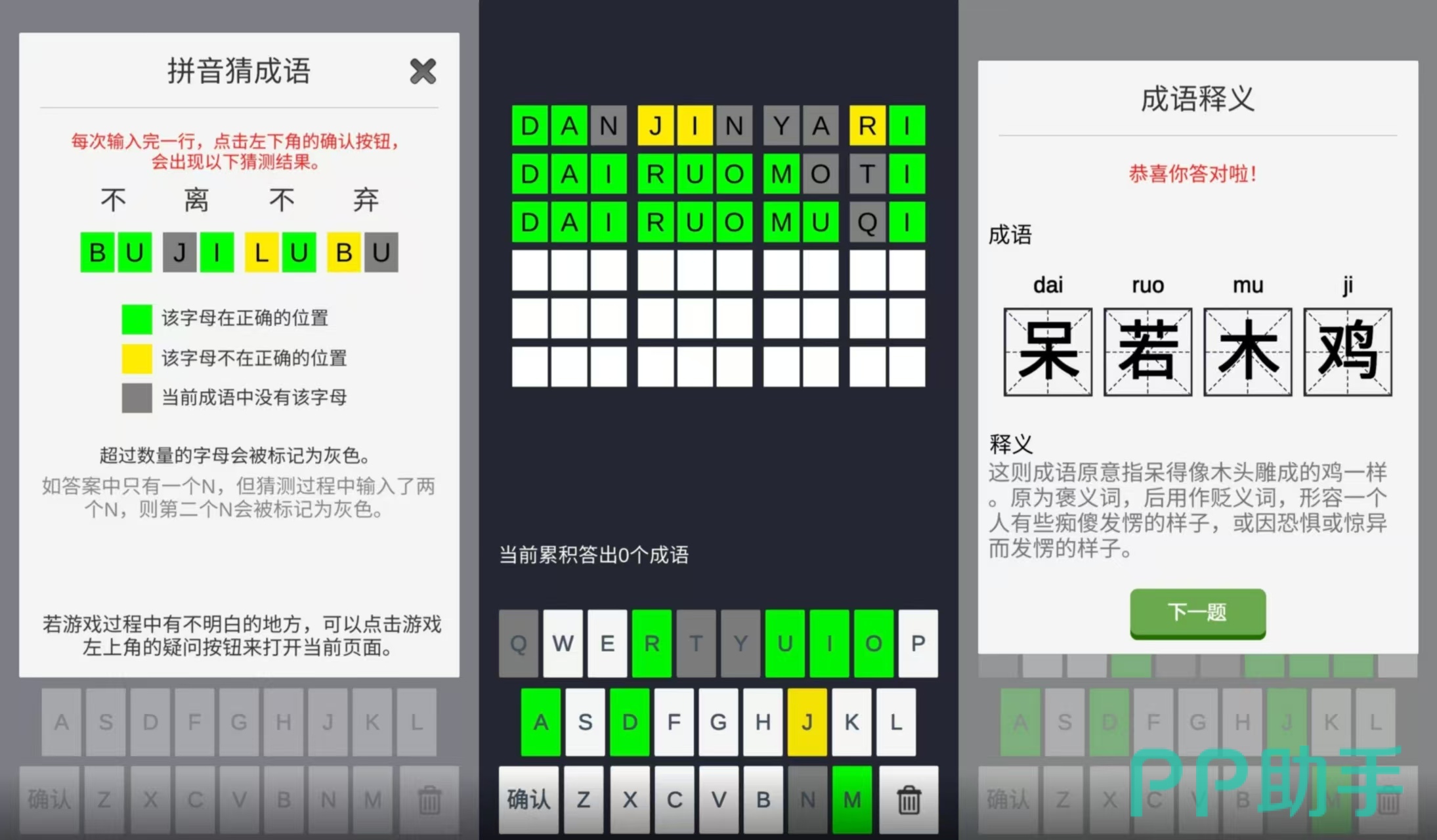 《拼音猜词语》玩家需要根据游戏中给出的拼音来猜词语当玩家成功的猜对成语之后可以看到成语的释义。游戏里面猜对的成语数量会逐渐累积。在一堆不同拼音字母中进行挑选,当玩家拼写正确会变成绿色的图标,拼写错误会用黄色的图标来展示。游戏的界面设计的非常简洁,操作也非常简单,只要玩家认真的去思考,利用一些休闲的时间就能玩上几关。