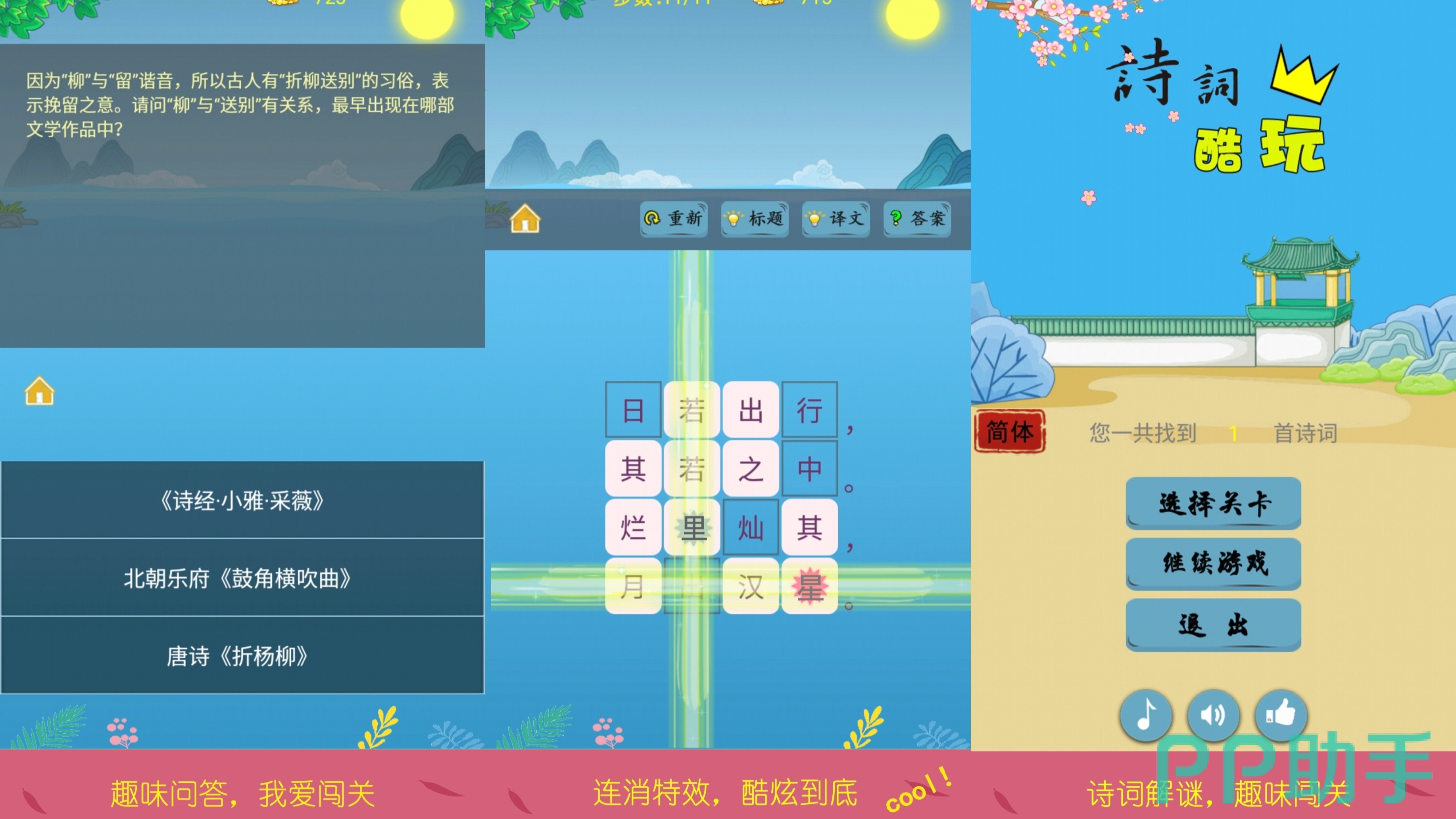 《诗词酷玩》游戏中一共集结了400多首中华诗词,玩家需要通过不同的方式来完成游戏设置的挑战,游戏里面有一个舒缓的背景音乐,会帮助大家放松身心。可以从三种模式中进行挑选,每一种模式下分为了不同难度,在游戏闯关的过程中也会逐渐积累知识。每一个关卡会给出三个答案,需要玩家从三个答案中选择正确的一个,还贴心的设置了提示功能,可以帮助玩家更好的快速通关。