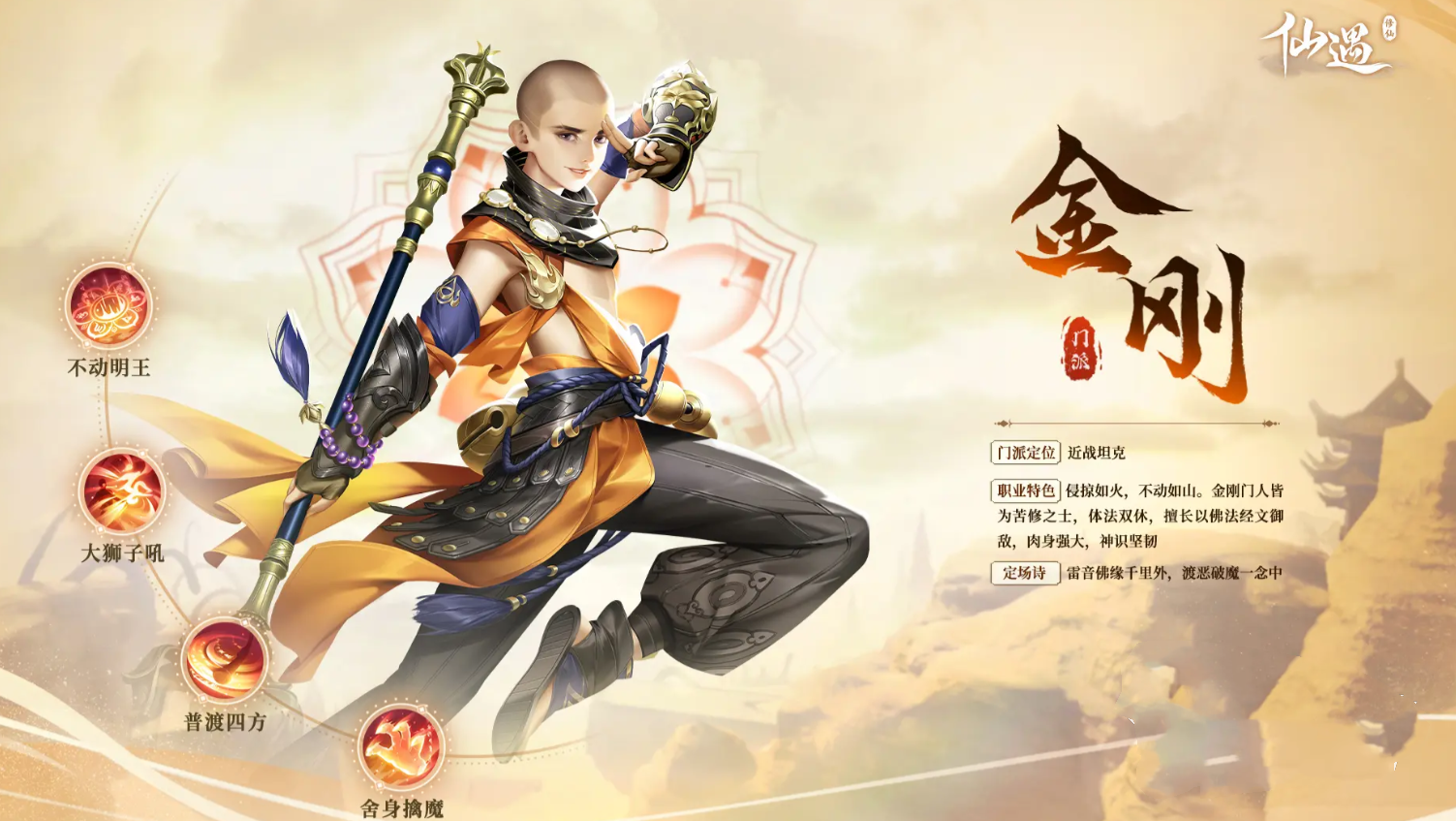 金刚职业的存在,就是为了告诉大家:一个合格的坦克有多重要。他们以佛法为根基,肉身强悍到能硬抗千军万马,是战场上队友最可靠的守护神。金刚的战斗方式以近战为主,技能霸道且充满力量感。走明王流派的金刚,更偏向输出型坦克,挥舞禅杖疯狂输出的同时还能免疫控制效果,简直是个移动的战争机器。而菩提流派则更注重团队守护,能结成不动明王阵,为队友提供防御和伤害减免效果,属于那种牺牲自己让队友C位发光的类型。