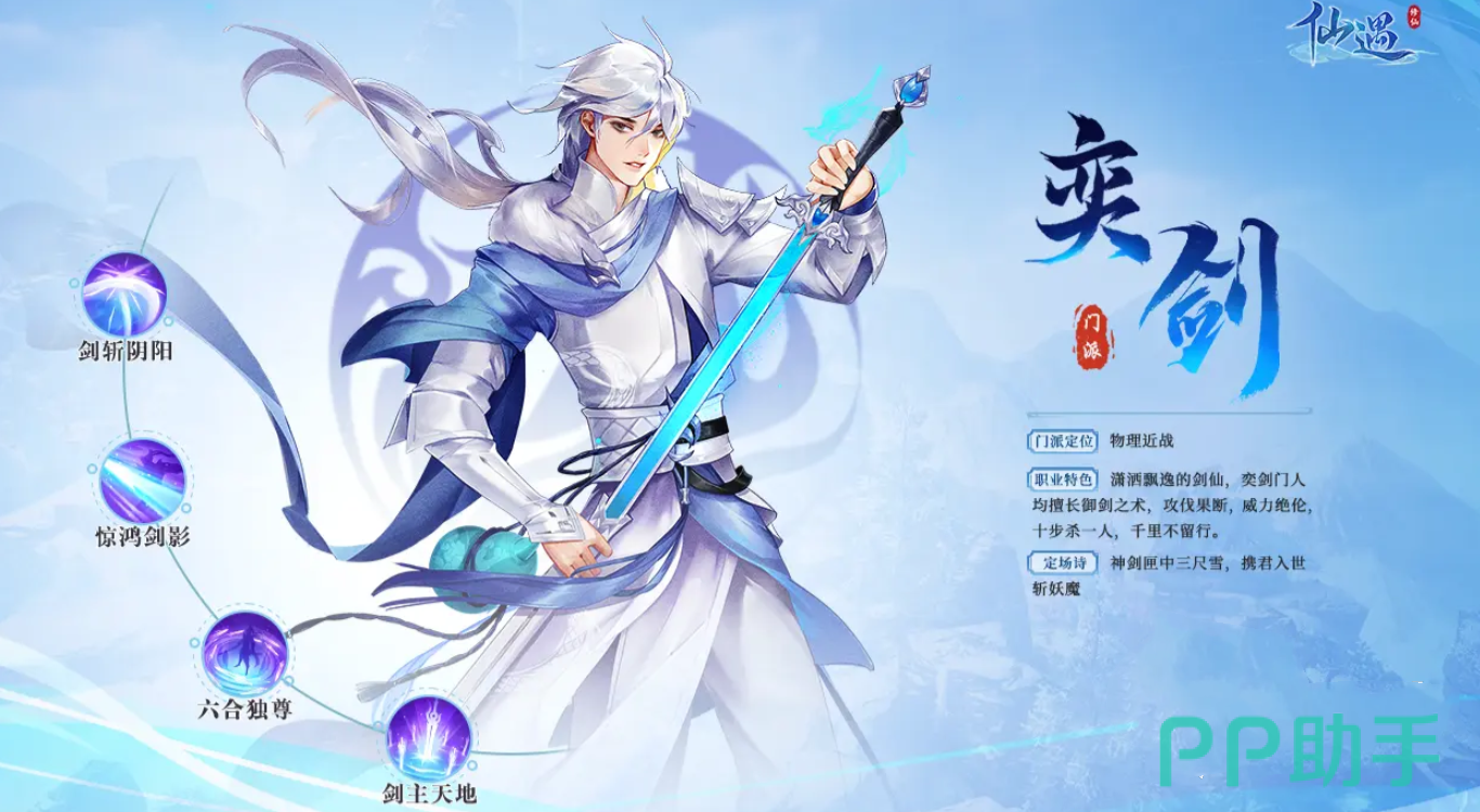 奕剑如同武侠小说中的剑客一般,一袭白衣搭配一柄仙剑,他们终年隐于昆仑雪域之巅修行剑道,虽在极寒之地却激情似火。其战斗方式多为近战,手法利落,注重以剑制敌人。奕剑分为藏剑与怒剑两大学派。藏剑派比较倾向于控制型的输出,使用六合剑阵等技能不断耗敌,打法稳中带劲;而且怒剑派属于爆发型的玩家,每招都大开大合、积累剑意之后在一瞬间就会爆发出来,直接将对手打得崩溃。藏剑主要是为那些希望稳固自己的地位并逐渐磨练对手的玩家设计的,而怒剑则是专为那些渴望一击取胜的玩家设计的。