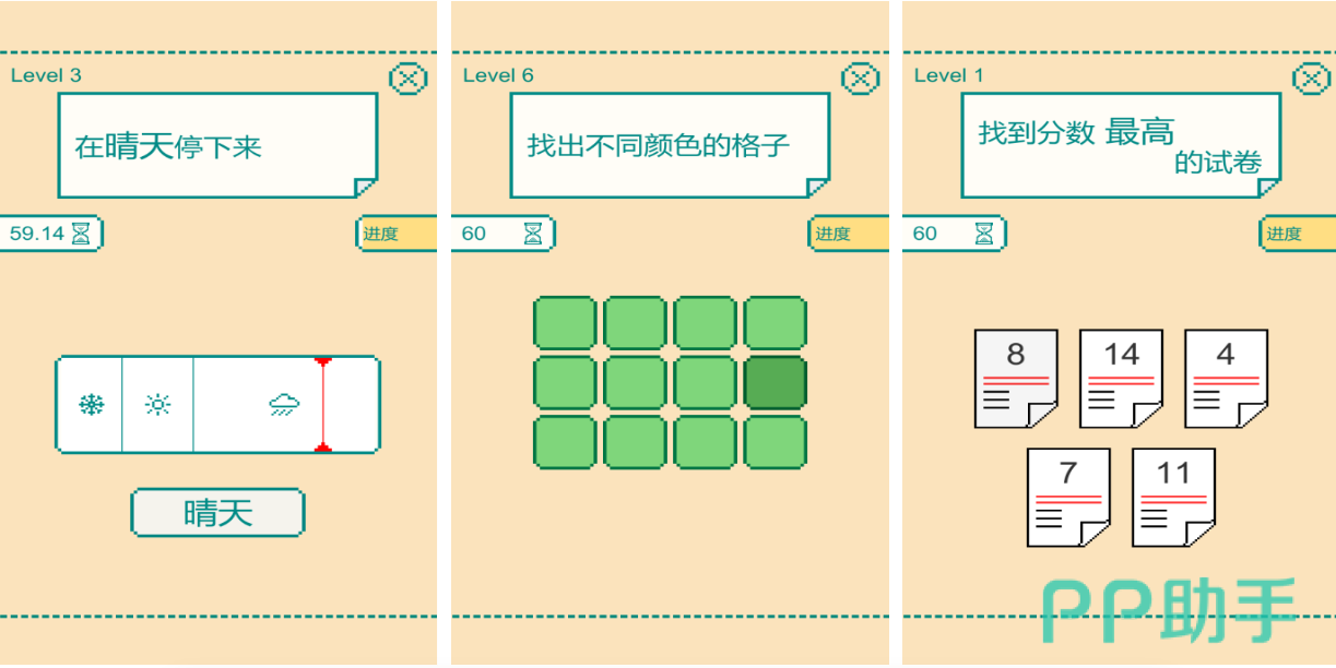 这是款节奏超级快的大脑锻炼类型手机游戏,形形色色的谜题设定会让大家的脑力得到开发,整体操作简单直接且谜题设计脑洞大开,特殊的解谜闯关模式也会令广大玩家越玩越上瘾,能锻炼左右脑的游戏机制也会让大家变得更加聪明,一分钟左右的快节奏游戏模式足以强化朋友们的思维逻辑。