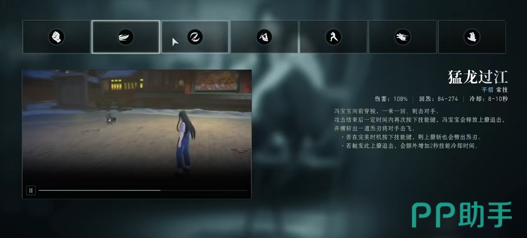 首先来看一下冯宝宝的平招,也就是常规技能猛龙过江,向前穿梭一来一回刺激对手,在攻击结束之后的一定时间内,再次按下技能键,会释放上撩追击,并横斩出一道炁刀,能将对手击飞。需要在完美时机下按下技能键,因为这样使得上撩斩也会劈出炁刀,如果触发上上撩追击,将额外增加两秒的技能冷却时间。普通攻击是全活不打折,凭借本能反应,矫健的相对手发动进攻,最多能连续攻击5次。