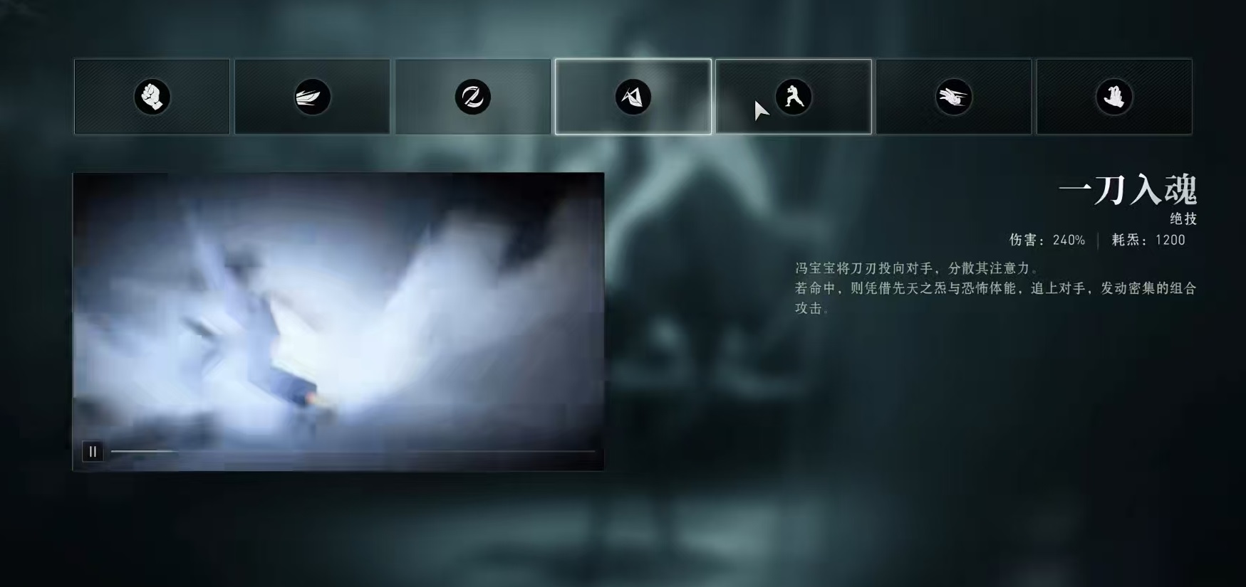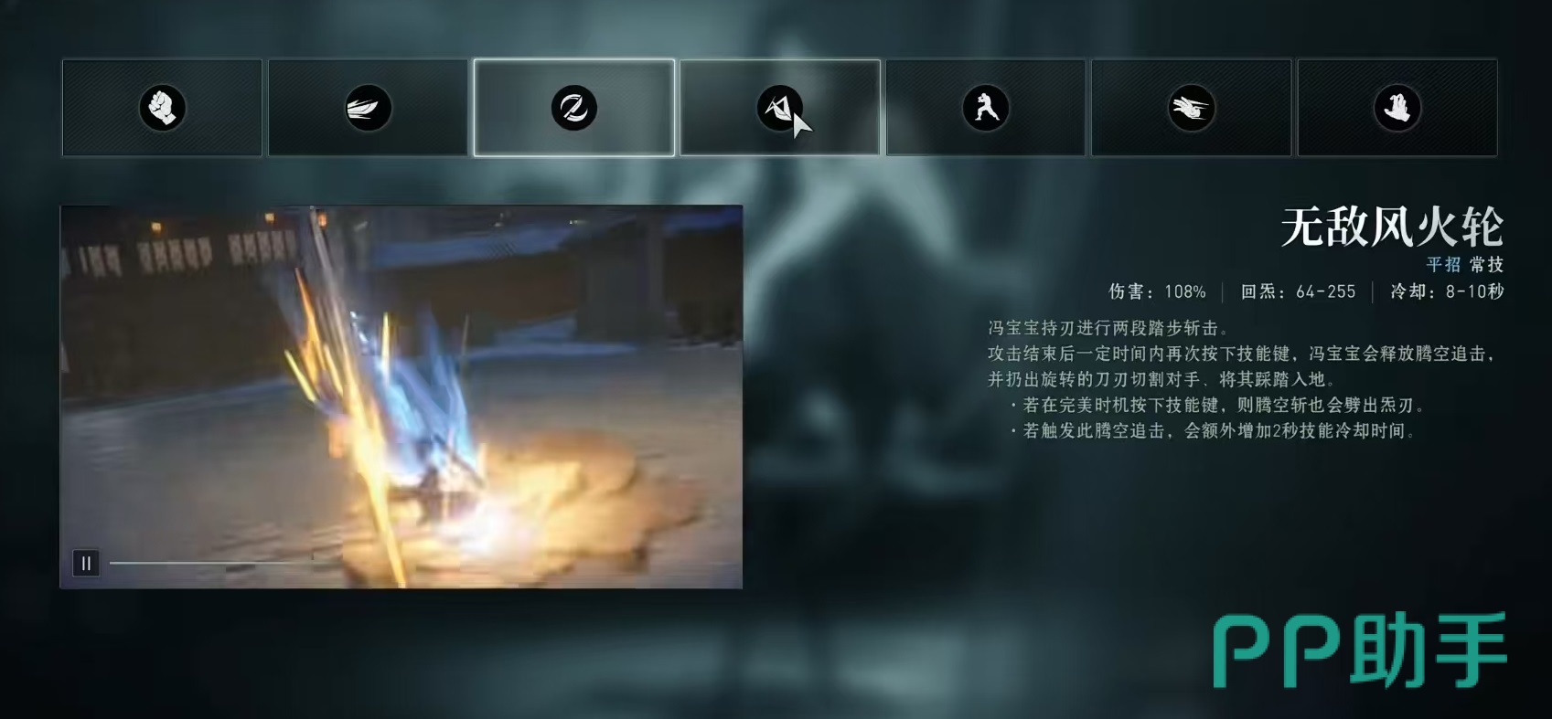 第2个技能是无敌风火轮,进行两段踏步斩击,在攻击结束后的一段时间内,再次按下此按键会释放腾空追击,并扔出旋转的刀刃切割对手,将其踩踏到地上。如果完美时机按下技能键,腾空斩也会劈出炁刀,如果触发腾空追击,增加两秒冷却时间。绝技是一刀入魂,将刀刃投向对手,分散注意力,如果成功命中目标,则凭借自身先天之气和恐怖体能追上对手,发动密集的组合攻击。