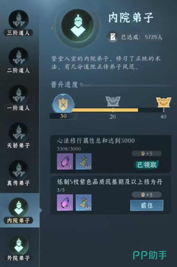 提高自身到院地位之后,还能提升洞府上限,除了参加悬赏之外,完成到院里面的试炼任务,也可以获得相应的威望,总体来说地位提升也是比较快。道院地位从最初的杂役弟子到后续外院弟子,内院弟子,真传弟子和天骄弟子,不仅仅有威望上的条件,还需要达到一定境界,例如天骄弟子只有达到金丹中期才能解锁。