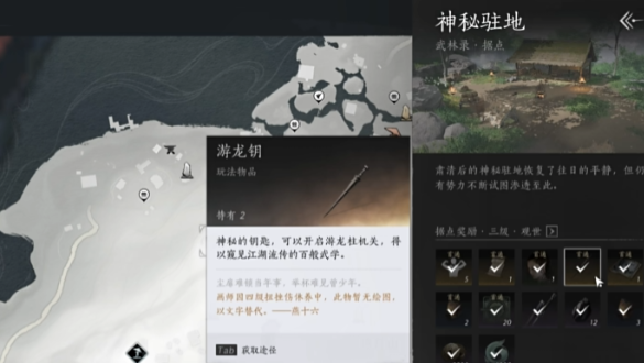 当然,也不是什么武学都能学,以剑法为例,只能偷到孤云门派的“积矩九剑”武学。消耗的游龙钥匙可以去驻地刷,也就是地图上红牌子的地方,驻地首通有给游龙钥匙。